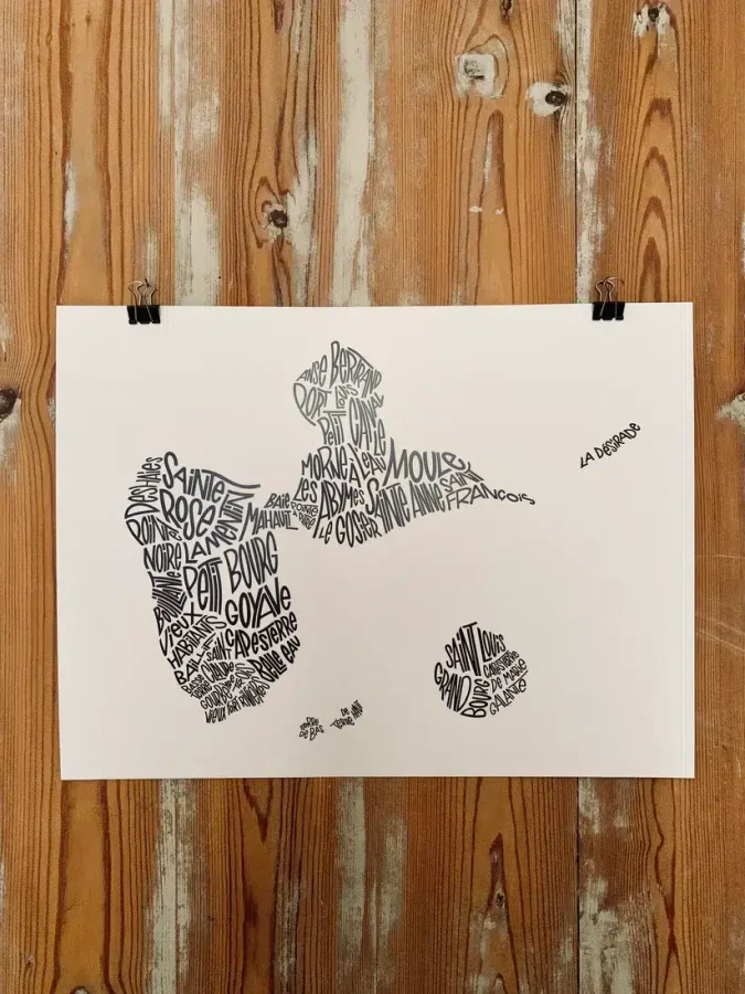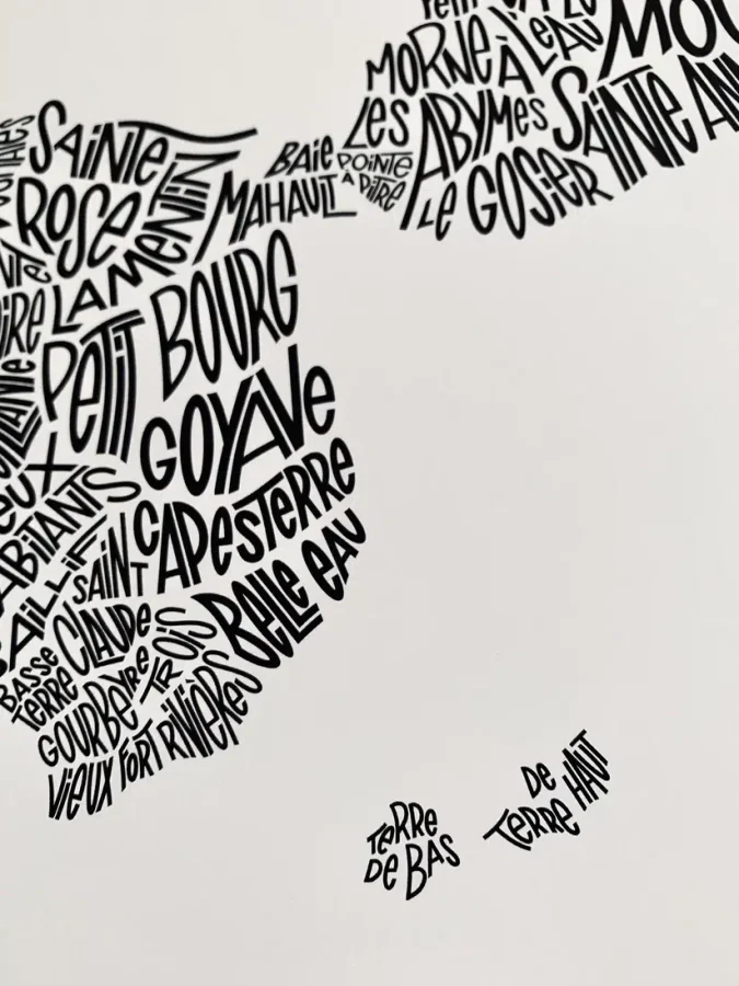 L’affiche s’inscrit dans une approche graphique résolument moderne, où la typographie occupe une place centrale. Les noms emblématiques des lieux incontournables de la Guadeloupe – comme Basse-Terre, Grande-Terre, ou encore les Saintes – sont stylisés avec une police audacieuse et harmonieuse, créant une œuvre aussi informative que décorative.