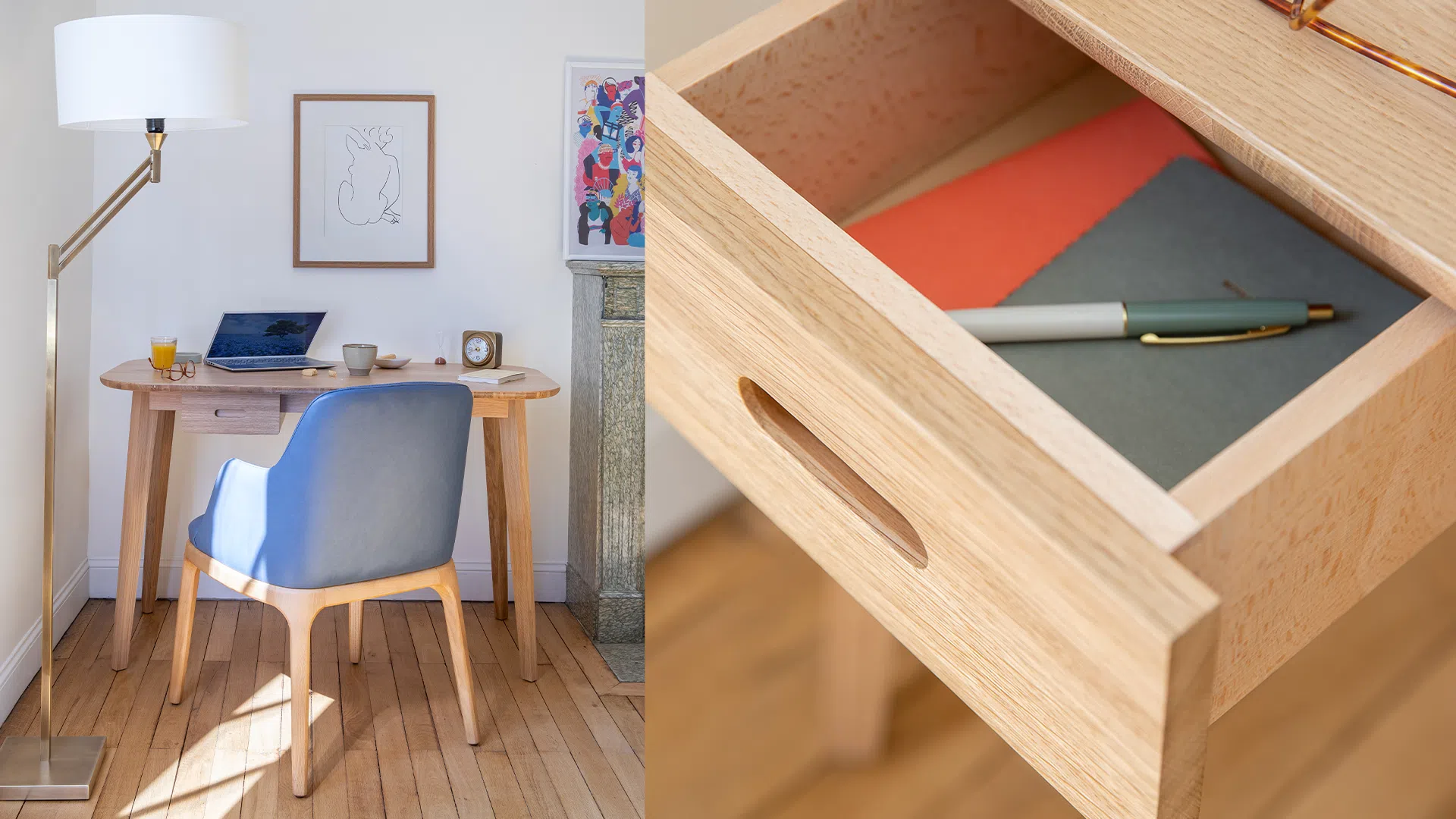 Le bureau Snack a été pensé pour répondre aux besoins d’un usage quotidien, que ce soit pour le télétravail, l’étude ou l’écriture. Sa dimension de 120 cm offre une surface confortable, tout en restant compacte et adaptable aux espaces restreints. Le chêne massif utilisé provient de forêts françaises gérées durablement, en cohérence avec les engagements environnementaux de Dasras et sa volonté de proposer un mobilier responsable.