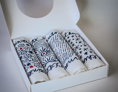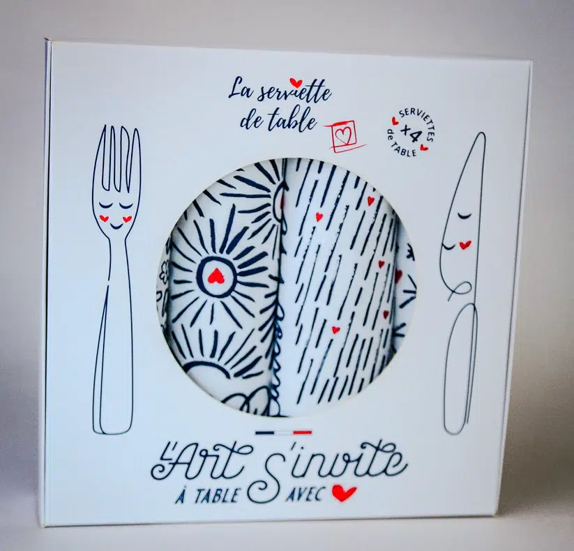 Ce coffret de 4 serviettes de table est une invitation à célébrer le rythme des saisons à travers des illustrations sensibles et colorées signées Jana. Chaque pièce est réalisée à partir de chutes de tissus recyclés, valorisées avec soin dans les ateliers du Nord.