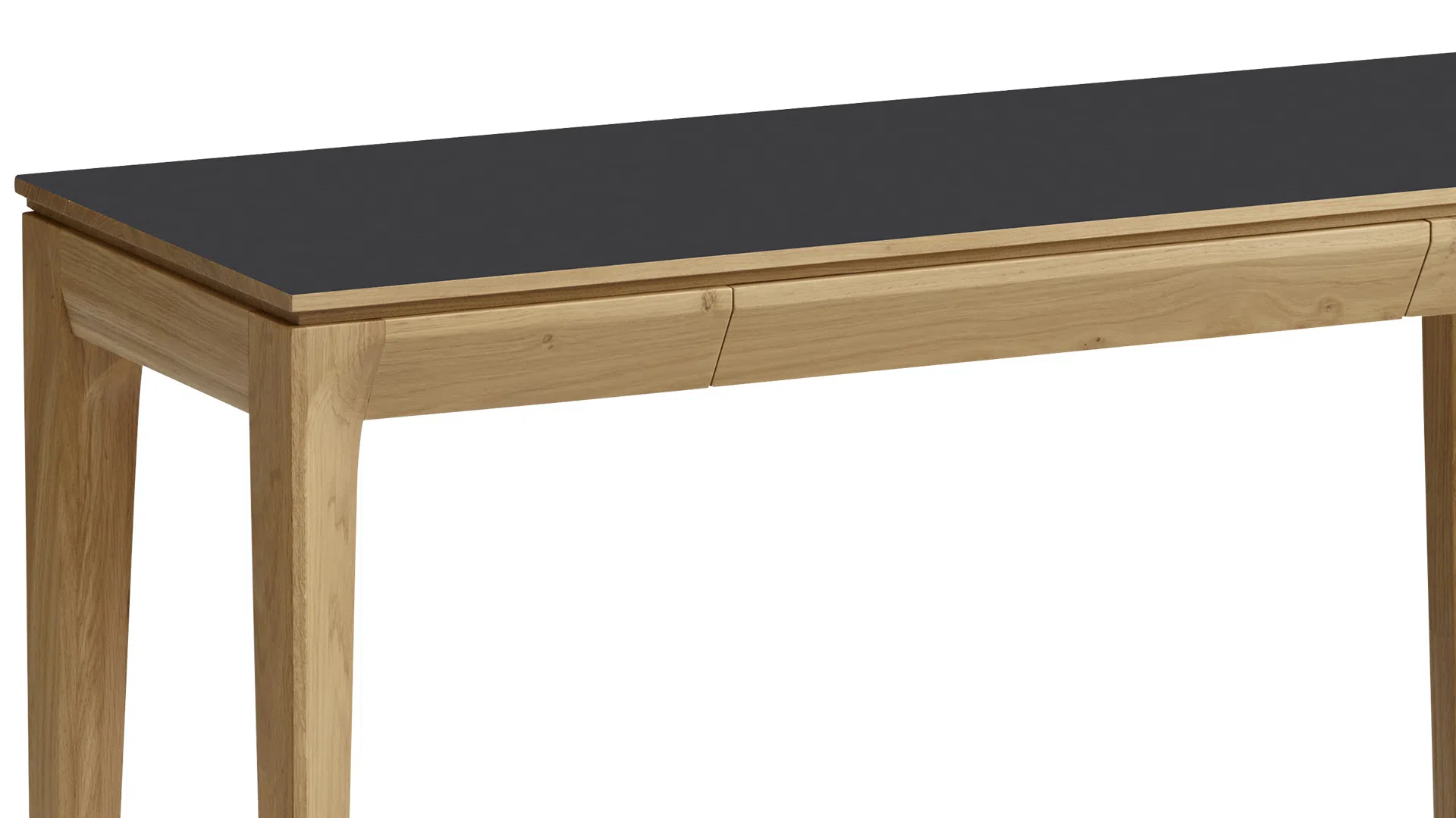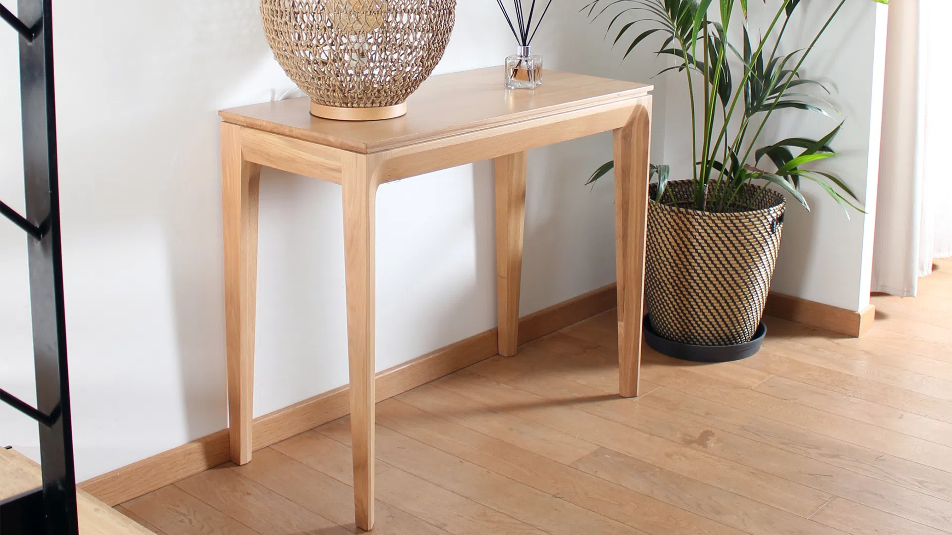 Le chêne massif teinte naturelle offre solidité et chaleur visuelle. Les veines du bois sont mises en valeur par la finition naturelle, apportant une touche de lumière et un caractère authentique à la console. Dasras sélectionne ses bois dans des forêts françaises gérées durablement, respectant ainsi l’environnement et assurant la durabilité des meubles.