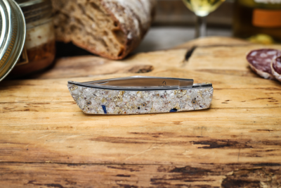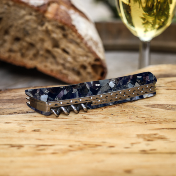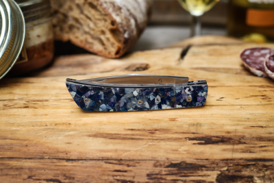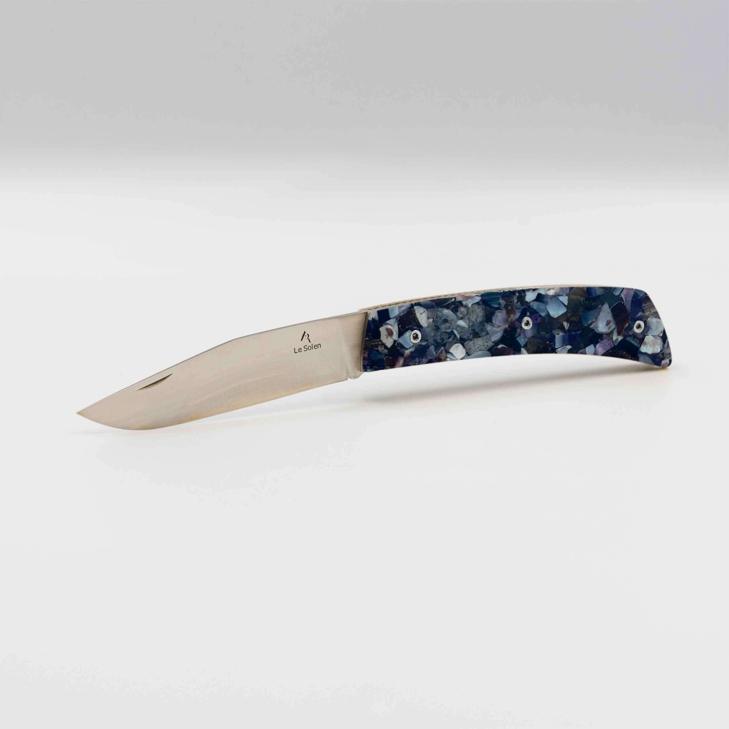 Le Solen Classique est un couteau de poche pliant qui se distingue par son manche composé de véritables coquillages recyclés, principalement des moules et des huîtres issus de la région. Cette démarche innovante permet de valoriser des coquillages qui, autrement, auraient été jetés, et de leur offrir une seconde vie sous la forme d’un objet artisanal élégant et durable. Les fragments de moules, avec leurs teintes bleu profond et leurs reflets irisés, se marient harmonieusement avec son manche unique.