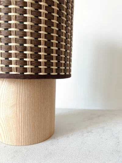 Grande lampe en frêne massif avec abat-jour en raphia marron, élégance et naturel au rendez-vous.