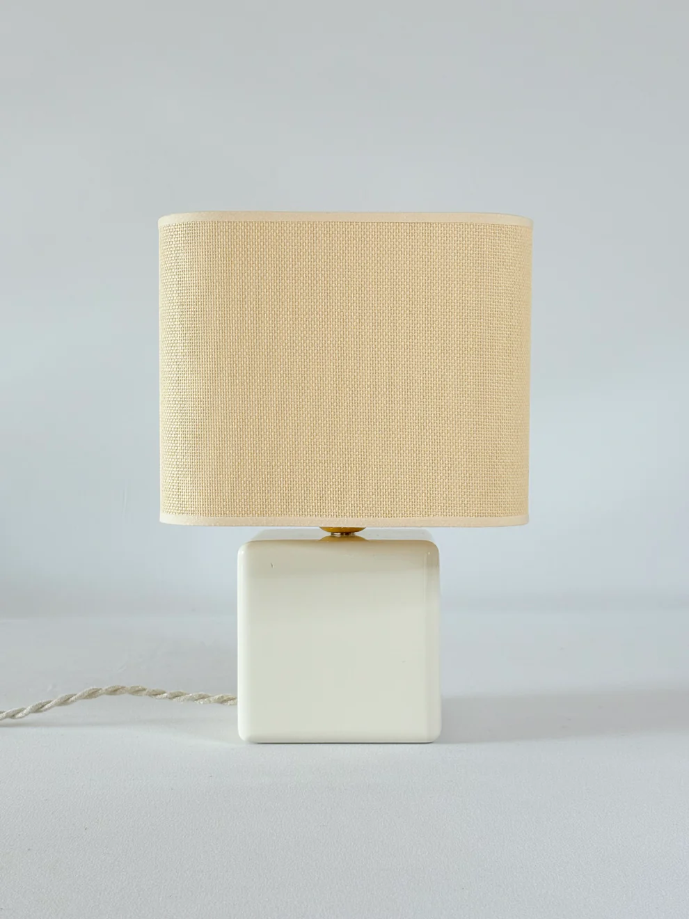 La finition laquée, subtilement satinée, met en valeur la teinte crème et confère à la lampe une allure raffinée et contemporaine. L’abat-jour, soigneusement conçu, diffuse une lumière douce et enveloppante, idéale pour créer une ambiance apaisante dans une chambre, un coin lecture ou un salon. La simplicité de la forme et la pureté de la couleur permettent à cette lampe de s’intégrer aussi bien dans des décors minimalistes que dans des ambiances plus chaleureuses.